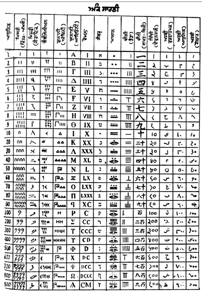 ਪਹਿਲਾਂ 1 ਤੋਂ ਲੈ ਕੇ 6 ਤਕ ਲਈ ਖੜੀਆਂ ਲੀਕਾਂ ਵਰਤੀਆਂ ਜਾਂਦੀਆਂ ਸਨ। ਪਿਛੋਂ 5, 10, ਆਦਿ ਸੰਖਿਆਵਾਂ ਵਿਚ ਵਰਤੇ ਜਾਂਦੇ ਸ਼ਬਦਾਂ ਦੇ ਪਹਿਲੇ ਅੱਖਰਾਂ ਦੀ ਵਰਤੋਂ ਅੰਕਾਂ ਦੀ ਥਾਂ ਹੋਣ ਲਗ ਪਈ। ਤੀਜੀ ਸਦੀ ਈ. ਪੂ. ਦੇ ਲੇਖਾਂ ਵਿਚ ਇਸੇ ਪ੍ਰਣਾਲੀ ਦਾ ਪਤਾ ਲਗਦਾ ਹੈ। ਉਸ ਦੇ ਪਿੱਛੋਂ ਵਰਣ-ਮਾਲਾ ਦੇ ਅੱਖਰ ਕ੍ਰਮ ਅਨੁਸਾਰ 1 ਤੋਂ 9 ਤੀਕ ਸੰਖਿਆਵਾਂ ਲਈ ਵਰਤੇ ਜਾਣ ਲੱਗੇ ਅਤੇ 10 ਤੋਂ 90 ਤੀਕ ਅਤੇ 100 ਤੋਂ 900 ਤਕ ਲਈ ਬਾਕੀ ਅੱਖਰਾਂ ਦੀ ਵਰਤੋਂ ਕੀਤੀ ਜਾਣ ਲੱਗੀ।