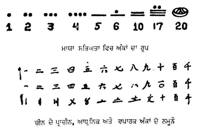 ਯੂਕਾਟਾਨ (Yucatan) ਮੈਕਸੀਕੋ ਅਤੇ ਮੱਧ ਅਮਰੀਕਾ ਦੀ ਮਾਯਾ (Maya) ਸਭਿਅਤਾ ਪੁਰਾਣੇ ਸਮਿਆਂ ਵਿਚ ਕਾਫ਼ੀ ਤਰੱਕੀ ਤੇ ਰਹੀ ਹੈ। ਉਥੇ ਬਿੰਦੀਆਂ ਨਾਲ 1, 2, 3 ਨੂੰ ਦਰਸਾਇਆ ਜਾਂਦਾ ਸੀ। ਸਿੱਧੀ ਲੇਟਵੀਂ ਲਕੀਰ ਪੰਜ ਨੂੰ ਅਤੇ ਗਲ ਚੱਕਰ 20 ਨੂੰ ਦਰਸਾਉਂਦਾ ਸੀ। ਇਸ ਤਰੀਕੇ ਨਾਲ ਲਿਖੀਆਂ ਕੁਝ ਰਕਮਾਂ ਹਠ ਵਿਖਾਈਆਂ ਜਾਂਦੀਆਂ ਹਨ :