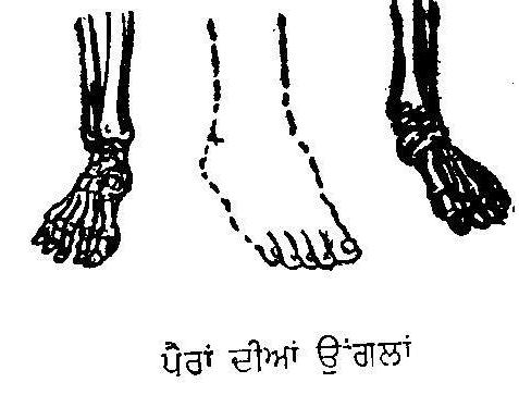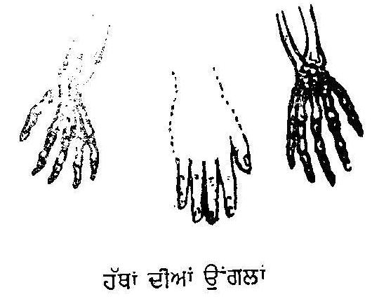ਪੰਜ ਉਂਗਲੀਆਂ ਕਦੇ ਬਰਾਬਰ ਨਹੀਂ ਹੁੰਦੀਆਂ । ਹਰ ਉਂਗਲੀ ਦੀ ਲੰਬਾਈ, ਆਪਣੇ ਕੰਮ ਤੇ ਸਥਾਨ ਮੁਤਾਬਕ ਵੱਖਰੀ ਹੈ। ਹੱਥ ਦੀ ਬਾਹਰ ਵਾਲੀ ਪਹਿਲੀ ਉਂਗਲੀ ਮੋਟੀ ਤੇ ਛੋਟੀ ਹੁੰਦੀ ਹੈ। ਇਸਨੂੰ ਅੰਗੂਠਾ ਆਖਦੇ ਹਨ। ਇਹ ਸਭ ਤੋਂ ਵਧ ਲੋੜੀਂਦੀ ਤੇ ਫੁਰਤੀਲੀ ਹੈ। ਇਸਦੇ ਨਕਾਰੇ ਹੋ ਜਾਣ ਤੇ ਹੱਥ ਦੀ ਕਾਰਜ ਸ਼ਕਤੀ ਅੱਧੀ ਹੋ ਜਾਂਦੀ ਹੈ। ਬਾਕੀ ਚਾਰ ਉਂਗਲੀਆਂ ਦੀ ਰਲ ਕੇ ਅੱਧੀ ਕਾਰਜ-ਸ਼ਕਤੀ ਰਹਿ ਜਾਂਦੀ ਹੈ। ਇਨ੍ਹਾਂ ਦੇ ਨਾਂ ਇਸ ਪਰਕਾਰ ਹਨ, ਮੂਹਰਲੀ (index finger) ਗਭਲੀ (middle), ਅੰਗੂਠੀ ਵਾਲੀ ਉਂਗਲੀ (ring finger) ਅਤੇ ਚੀਚੀ (little finger)