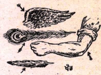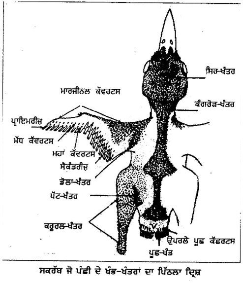 (ਉ) ਛਾਤੀ-ਖੰਭ, (ਅ) ਪਿਛਲੇ ਹਿੱਸੇ ਦੇ ਖੰਭ ਜਿਵੇਂ ਹੇਠਲੇ ਪਾਸੇ ਤੋਂ ਦਿਸਦੇ ਹਨ। (ੲ) ਦੇਹ-ਖੰਭ ਦੀ ਮੱਧ ਖੰਭ-ਡੰਡੀ ਤੋਂ ਵੱਖ ਕੀਤੇ ਹੋਏ ਖੰਭ-ਫ਼ਲ ਦੇ ਇਕ ਹਿੱਸੇ ਦਾ ਪਿਛਲਾ ਦ੍ਰਿਸ਼ (ਵੱਡਾ ਕੀਤਾ ਹੋਇਆ); (ਸ) ਖੰਭ- ਫਲ ਤੋਂ ਪੂਰੀ ਤਰ੍ਹਾਂ ਵਖ ਕੀਤੇ ਹੋਏ ਬਾਰਬ ਦਾ ਹੇਠਲਾ ਦ੍ਰਿਸ਼ (ਬਹੁਤ ਜ਼ਿਆਦਾ ਵੱਡਾ ਕੀਤਾ ਹੋਇਆ)।