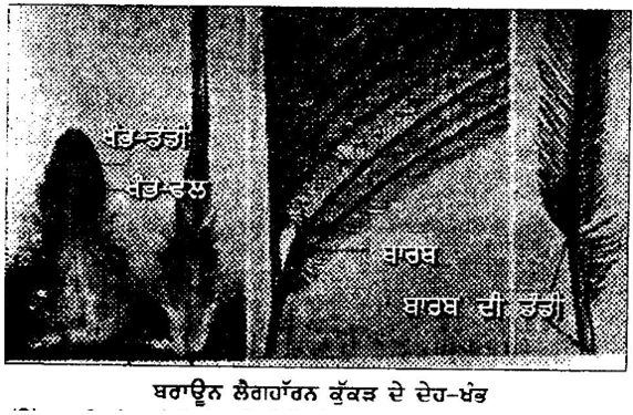 ਖੰਭਾਂ ਵਿਚ ਲਿੰਗੀ ਫਰਕ –– ਕਈ ਪੰਛੀਆਂ ਦੇ ਨਰ ਪ੍ਰਾਣੀ ਦੇ ਖੰਭ ਮਾਦਾ ਤੇ ਖੰਭਾਂ ਨਾਲੋਂ ਬਹੁਤ ਵਖਰੇ ਹੁੰਦੇ ਹਨ। ਉਦਾਹਰਣ ਵਜੋਂ ਬਰਾਊਨ ਲੈੱਗਹਾਰਨ ਕੁੱਕੜ ਦੇ ਨਰ ਦੇ ਪਿਛਲੇ ਖੰਤਰ ਦੇ ਖੰਭ ਲੰਮੇ, ਝੁਕੇ ਹੋਏ, ਝਾਲਰਦਾਰ, ਸੁਨਿਹਰੇ ਰੰਗ ਦੇ ਹੁੰਦੇ ਹਨ ਜਦੋਂ ਕਿ ਮਾਦਾ ਦੇ ਇਸ ਹਿੱਸੇ ਦੇ ਖੰਭ ਛੋਟੇ, ਗੋਲ ਸਿਰਿਆਂ ਵਾਲੇ ਅਤੇ ਬਿੰਦੀਆਂ ਵਾਲੇ ਹੁੰਦਾ ਹਨ। ਇਸ ਪੰਛੀ ਵਿਚ ਮਾਦਾ ਵਰਗੇ ਖੰਭਾਂ ਦਾ ਬਣਨਾ ਅੰਡਕੋਸ਼ਾਂ ਦੇ ਇਕ ਹਾਰਮੋਨ ਰਾਹੀਂ ਕੰਟਰੋਲ ਹੁੰਦਾ ਹੈ। ਹੋਰ ਪੰਛੀਆਂ ਵਿਚ ਖੰਭਾਂ ਦੀ ਲਿੰਗੀ ਦੋ-ਰੂਪਤਾ ਹੋਰ ਹਾੱਰਮੋਨਾਂ ਕਾਰਨ ਹੁੰਦੀ ਹੈ।