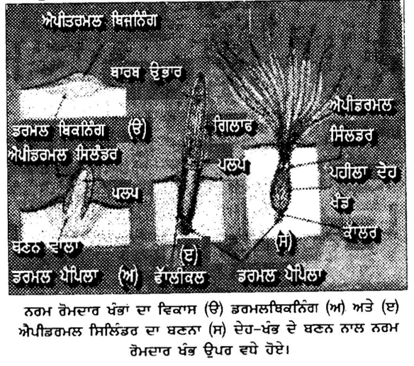 ਬੋਟ ਦੇ ਨਰਮ ਰੋਮ –– ਹਰੇਮ ਜਰਮ-ਮੂਲ ਆਧਾਰ ਉੱਤੇ ਪਰਿਵਰਧਨ ਕਾਰਨ ਵਧਦਾ ਹੈ। ਐਪੀਡਰਮਲ ਭਿੱਤੀ ਦੇ ਅੰਦਰਲੇ ਹਿੱਸੇ ਤੋਂ ਉਭਾਰ ਬਣਦੇ ਹਨ। ਹਰੇਕ ਐਪੀਡਰਮਲ ਉਭਾਰ ਤੋਂ ਬਾਰਬਿਊਲਾਂ ਦੀਆਂ ਦੋਵੇਂ ਕਤਾਰਾਂ ਸਮੇਤ ਬਾਰਬ ਬਣਦਾ ਹੈ। ਜਰਮ-ਮੂਲ ਦੇ ਆਧਾਰ ਉੱਤੇ ਇਕ ਮੋਟਾ ਨੜਾ ਜਿਹਾ (Calamus) ਬਣਦਾ ਹੈ ਜੋ ਨਰਮ ਰੋਮਦਾਰ ਖੰਭਾਂ ਦਾ ਆਧਾਰ ਬਣਦਾ ਹੈ। ਇਨ੍ਹਾਂ ਸਾਰੀਆਂ ਹਾਲਤਾਂ ਦੇ ਦੌਰਾਨ ਖੰਭ ਜਰਮ-ਮੂਲ ਦਾ ਆਧਾਰ ਚਮੜੀ ਵਿਚ ਖੁੱਭਦਾ ਜਾਂਦਾ ਹੈ ਤੇ ਇਸ ਦੇ ਦੁਆਲੇ ਐਪੀਡਰਮਲ ਤਹਿ ਵਾਲੀ ਇਕ ਨਲੀ ਬਣ ਜਾਂਦੀ ਹੈ ਜਿਸਨੂੰ ਖੰਭ-ਫਾੱਲੀਕਲ ਕਹਿੰਦੇ ਹਨ।