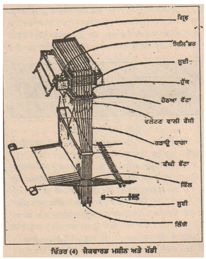 ਜੈਕਵਾਰਡ ਮਸ਼ੀਨ ਵਿਚ ਤਾਣੇ ਦੇ ਧਾਗੇ ਉੱਪਰ ਉੱਠਣ ਵਾਲੀਆਂ ਤਾਰਾਂ (ਹੁੱਕਾਂ) ਨਾਲ ਉੱਪਰ ਚੁੱਕੇ ਜਾਂਦੇ ਹਨ (ਚਿੱਤਰ 4)।