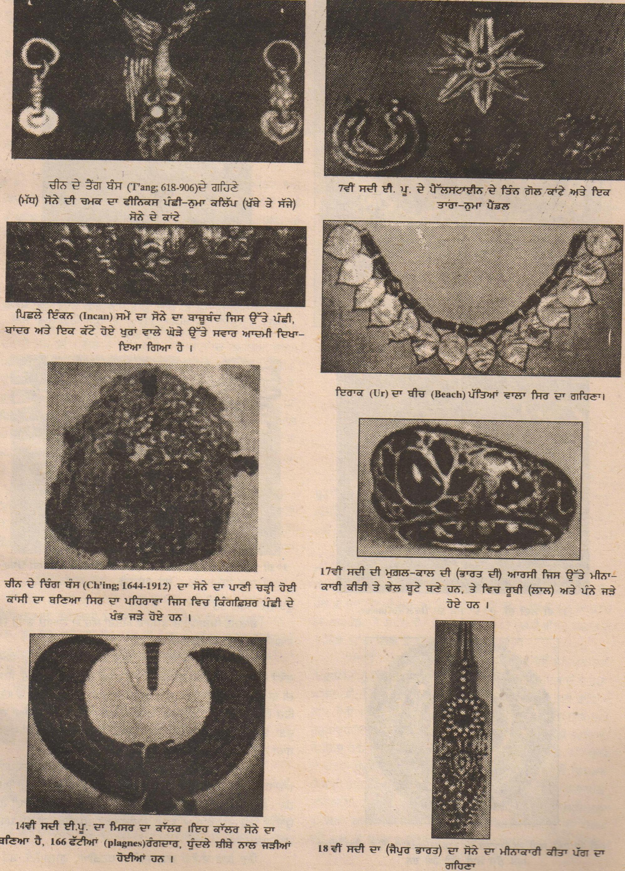 ਪੰਜਾਬ ਦੇ ਗਹਿਣੇ ਬਹੁਤਾ ਕਰਕੇ ਹੀਰੇ, ਮੋਤੀ ਜੜੇ ਸੋਨੇ ਜਾ ਚਾਂਦੀ ਦੇ ਹੁੰਦੇ ਹਨ। ਸ਼ੀਸ਼ੇ ਅਤੇ ਲਾਖ ਦੇ ਕੜੇ, ਹਾਥੀ-ਦੰਦ, ਘੋਗਿਆਂ ਆਦਿ ਦੇ ਗਹਿਣੇ ਵੀ ਪ੍ਰਚੱਲਤ ਹਨ। ਮੁਗ਼ਲ-ਕਾਲ ਦੌਰਾਨ ਉੱਤਰ ਵਿਚ ਪ੍ਰਚੱਲਤ ਪੱਥਰ, ਸ਼ੀਸ਼ੇ, ਧਾਤ ਤੇ ਲੱਕੜੀ ਦੇ ਮਣਕੇ ਇਸਨੂੰ ਬਾਬਲ, ਮਿਸਰ, ਈਰਾਨ ਦੀਆਂ ਸਭਿਅਤਾਵਾਂ ਨਾਲ ਜੋੜਦੇ ਹਨ।