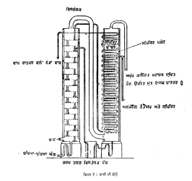 ਕਸ਼ੀਦਿਤ ਸ਼ਰਾਬ ਬਣਾਉਣ ਦੀਆਂ ਭੱਠੀਆਂ––ਅਲਕੋਹਲੀ ਕਸ਼ੀਦ ਦਾ ਸਿੱਧਾਂਤ ਅਲਕੋਹਲ (78.3˚ ਸੈਂ.) ਅਤੇ ਪਾਣੀ (100˚ ਸੈਂ.) ਦੇ ਵੱਖਰੇ ਵੱਖਰੇ ਉਬਾਲ ਦਰਜੇ ਤੇ ਨਿਰਭਰ ਹੈ। ਜੇ ਕਿਸੇ ਅਜਿਹੇ ਤਰਲ ਨੂੰ, ਜਿਸ ਵਿਚ ਅਲਕੋਹਲ ਹੋਵੇ 78.3˚ ਸੈਂ ਤੋਂ ਉੱਪਰ ਅਤੇ 100˚ ਸੈਂ. ਥੱਲੇ ਗਰਮ ਕੀਤਾ ਜਾਵੇ ਤਾਂ ਅਲਕੋਹਲ ਵਾਸ਼ਪ ਬਣ ਜਾਵੇਗੀ ਅਤੇ ਦੂਸਰੇ ਤਰਲ ਨਾਲੋਂ ਵੱਖਰੀ ਹੋ ਜਾਵੇਗੀ। ਇਸ ਨੂੰ ਅਲੱਗ ਦ੍ਰਵਿਤ ਕਰਕੇ ਵਧੇਰੇ ਅਲਕੋਹਲੀ ਸਮਰੱਥਾ ਵਾਲੇ ਤਰਲ ਵਿਚ ਬਦਲਿਆ ਜਾ ਸਕਦਾ ਹੈ। ਇਸ ਦੇ ਨਾਲ ਮਿਲਦਾ ਜੁਲਦਾ ਪ੍ਰੰਤੂ ਥੋੜ੍ਹਾ ਅਧੂਰਾ ਢੰਗ ਇਹ ਹੈ ਕਿ ਅਲਕੋਹਲ ਵਾਲੇ ਤਰਲ ਨੂੰ ਜਮਾ ਲਿਆ ਜਾਂਦਾ ਹੈ। ਪਾਣੀ 0˚ ਸੈਂ. ਤੋਂ ਥੱਲੇ ਜੰਮ ਜਾਂਦਾ ਹੈ ਅਤੇ ਅਲਕੋਹਨ––114˚ ਸੈਂ. ਤੇ ਜੰਮਦੀ ਹੈ, ਇਸ ਤਰ੍ਹਾਂ ਇਹ ਆਸਾਨੀ ਨਾਲ ਵੱਖਰੇ ਹੋ ਸਕਦੇ ਹਨ।
